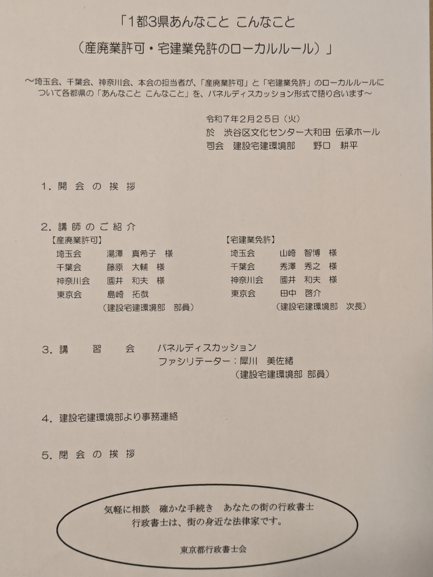 6月4日、所長の島崎が、「建設業許可Q&A」解説講座の講師を務めました。この度、東京都行政書士会のほうで、行政書士向けの「建設業許可Q&A」という冊子を発刊し、島崎も編集に携わったのですが、今回その冊子の内容について建設業許可申請を専門とする島崎を含めた3名で解説講義を行ったものです。