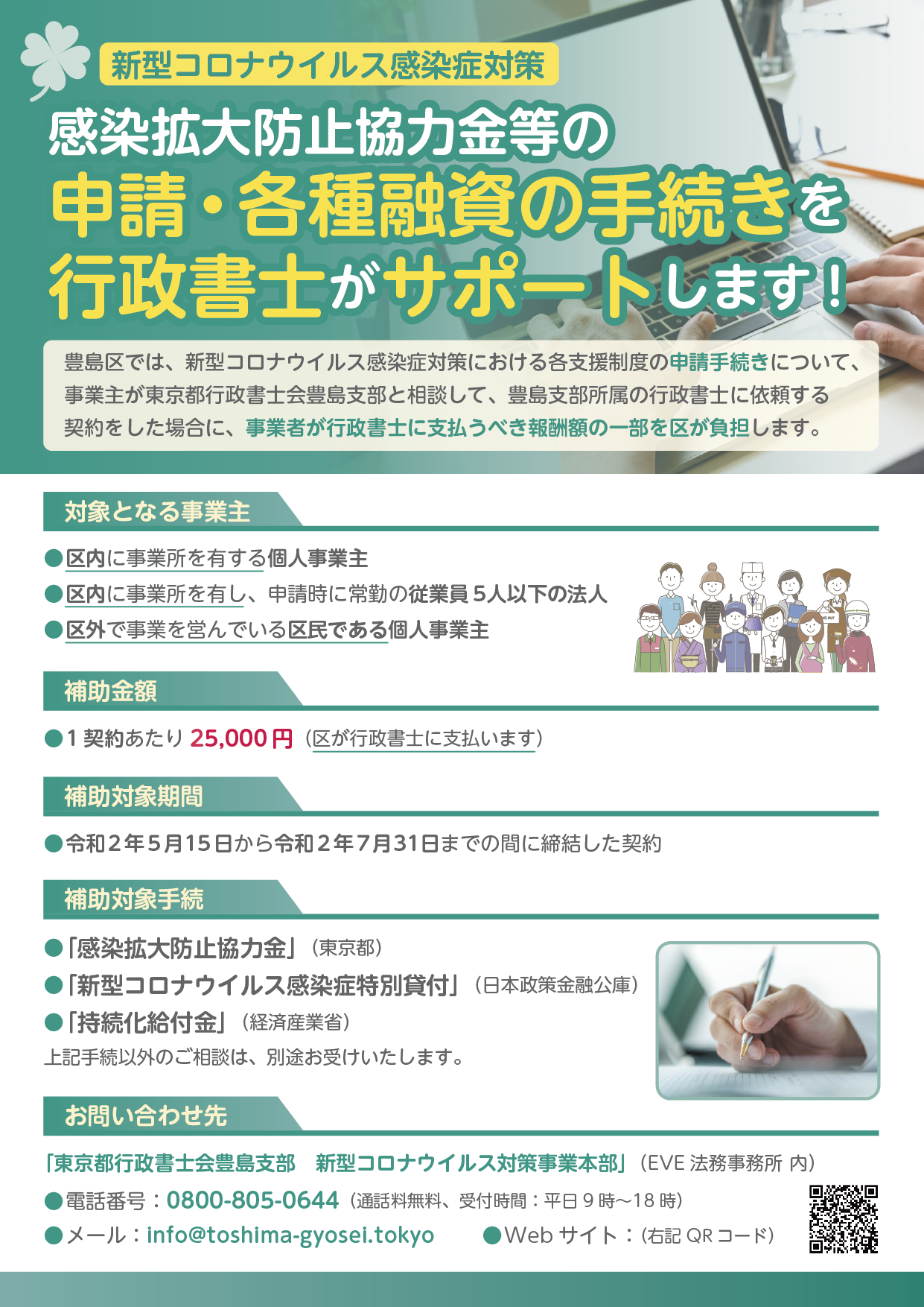 今回の対象となる事業者様は、豊島区に関連のある範囲に限られますが(添付告知チラシ参照)、新型コロナウイルスでお困りの事業者様は是非ご相談ください。電話0800-805-0644(平日9時~18時)です。