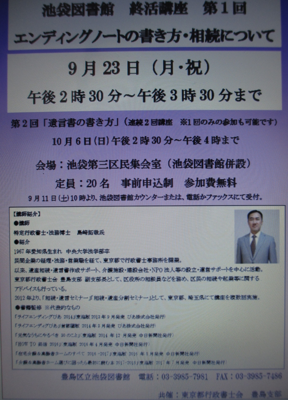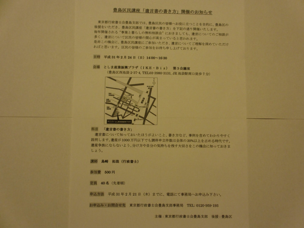 2月24日(日)としま産業振興プラザIKE・Bizにて、所長の島崎が豊島区民講座「遺言書の書き方」(主催:東京都行政書士会豊島支部/後援:豊島区)の講師を務めました。