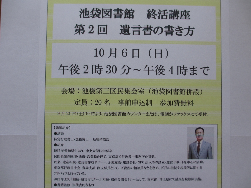 7月27日(土)としま産業振興プラザIKE・Bizにて、所長の島崎が豊島区民講座「遺言書の書き方」(主催:東京都行政書士会豊島支部/後援:豊島区)の講師を務めました。